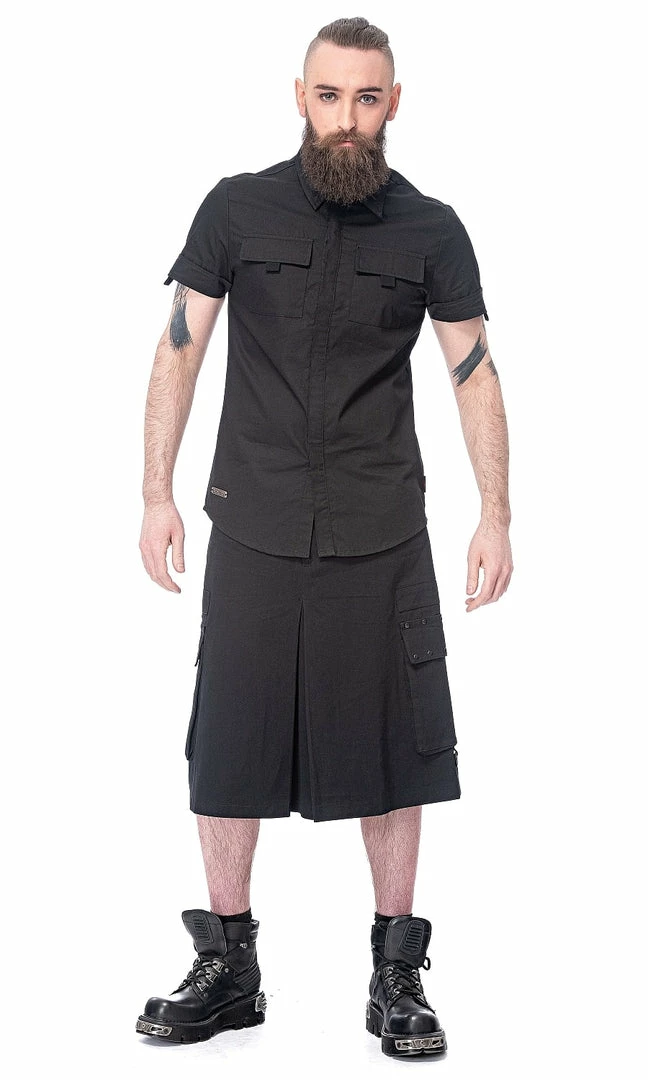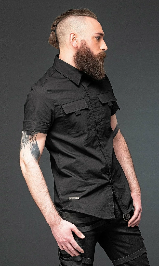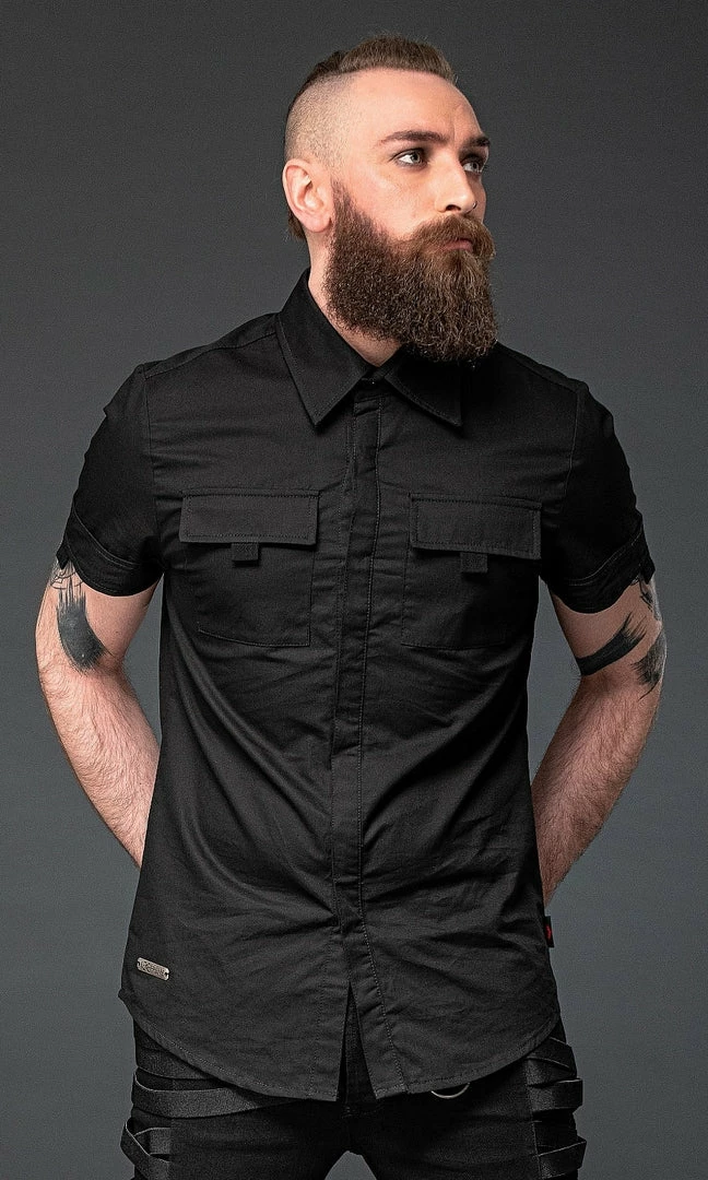 This elegant short-sleeved shirt with 2 breast pockets is perfect for all men who like things simple and elegant. The shirt has a concealed button placket and a collar. Black always fits ! Thanks to the timeless design, you are always elegantly dressed. This men’s shirt is a perfect basic and goes well with pants as well as skirts ! · short sleeve cotton shirt · concealed button placket · elegant shirt collar · two practical breast pockets · timeless design