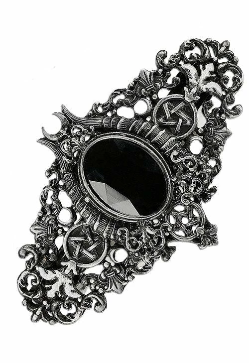 In the center we have put beautiful black polished stone surrounded by devil horns frame entwined by floral ornaments. On top there is a crescent moon and openwork pentagram symbol on the bottom. On both sides, we have designed symmetrical pentagrams and detailed gothic decorations.