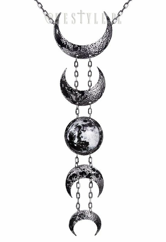 Necklace presents moon phases carved in alloy. In the center there is a graphic of a moon underneath the magnifying glass.