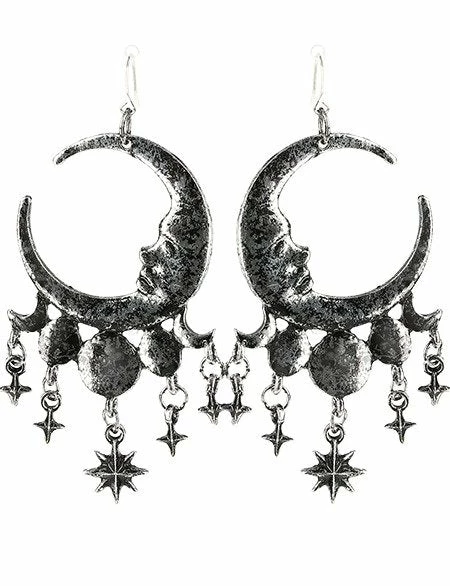 Oriental earrings with crescent moons, all phases and attached small stard.