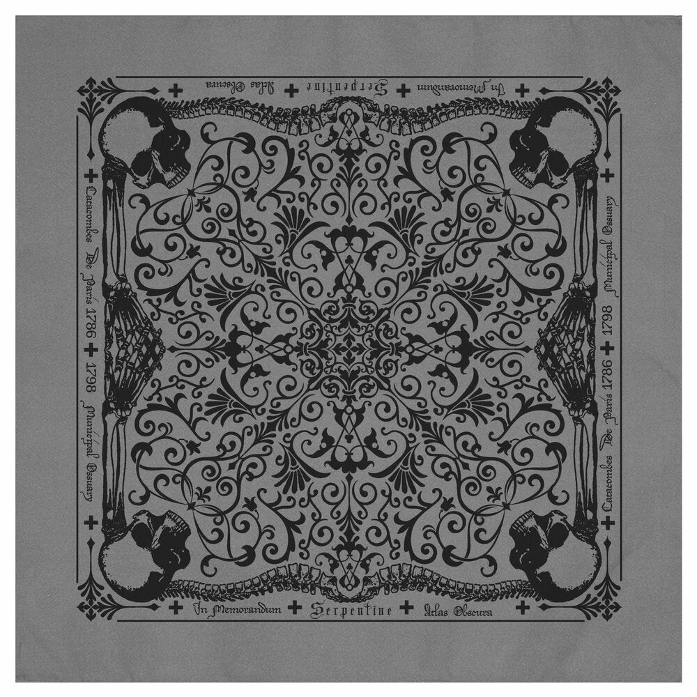 Catacombes Bandana is Black on Grey and designed diagonally so once it’s folded and tied it will display at it’s very best. Poly-cotton fabric blend makes it easy to wrap and tie on the go! One size fits all and measures approximately 21″ x 21″.