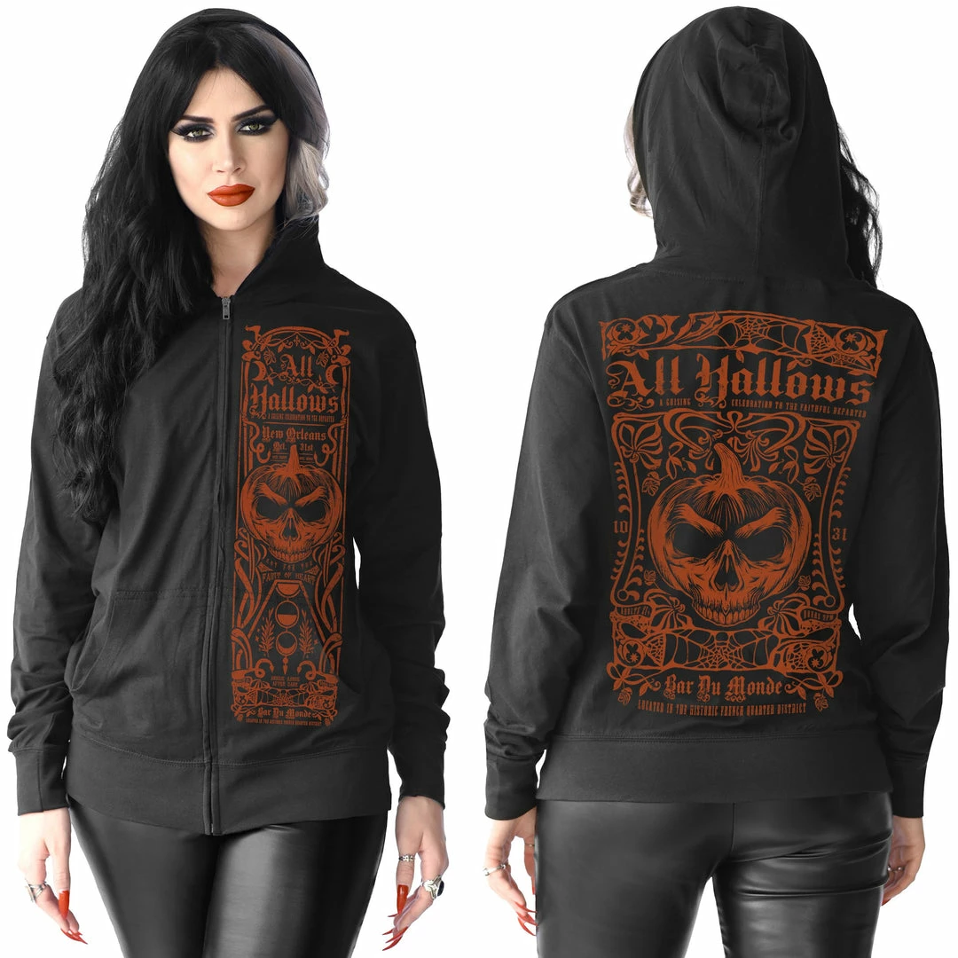 All Hallows Women’s Pull Zip Hoodie is Vintage Orange On Black. Comfortable lightweight Fleece and a Contemporary fit.