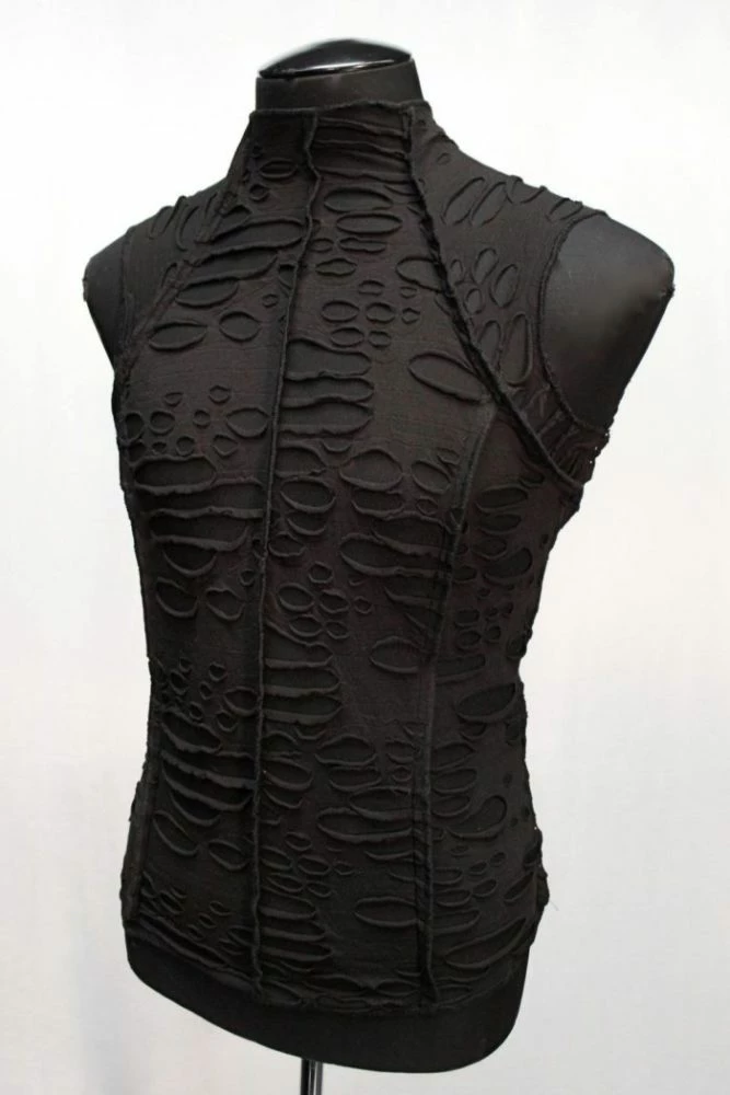 Future Shock! A tight fitting Science Fiction style T-shirt from the not so distant future. This t-shirt is made of comfortable double layer black stretch fabric. The top layer has been sprinkled with acid rain for a “decayed” appearance. The bottom layer is sheer stretch fabric. The exposed overlocked seams give the t-shirt a deconstructed futuristic appearance and accentuate the figure. Zips at the neck in back to make it easier to get over your head. Comes in sizes Small-XXL. Very cool.