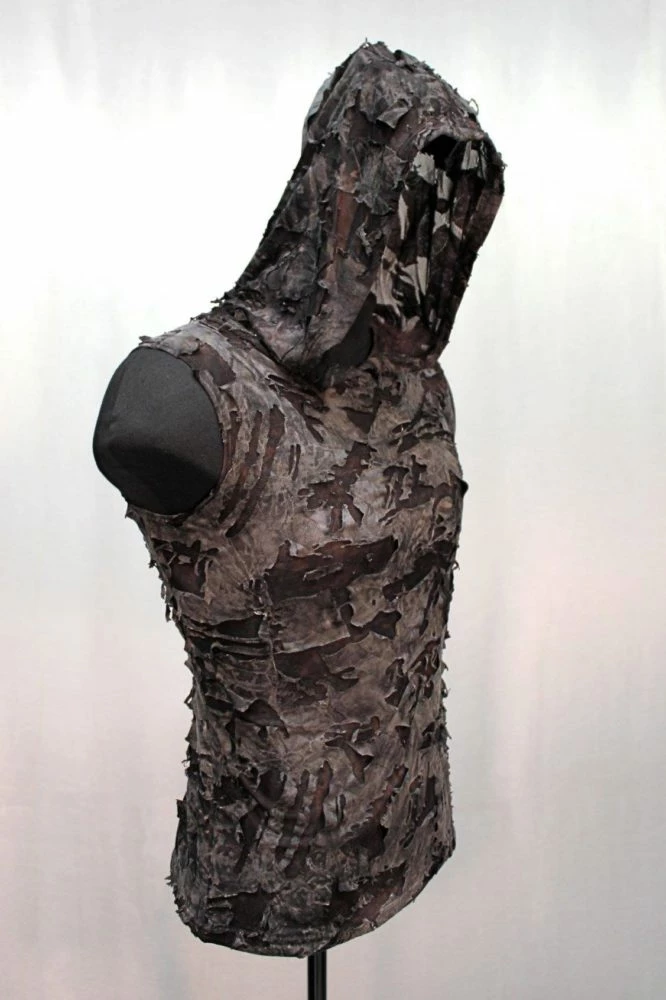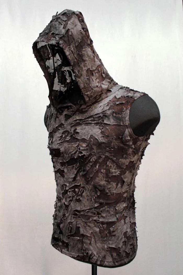 A post-apocalyptical classic t-shirt! A fitted hoody t-shirt made in comfortable double-layered stretch fabric. The top layer, a grey/black color is shredded giving this fabric a classic zombie look. This style is sleeveless with a large, stretchy hood. Comes in sizes small-XXL.