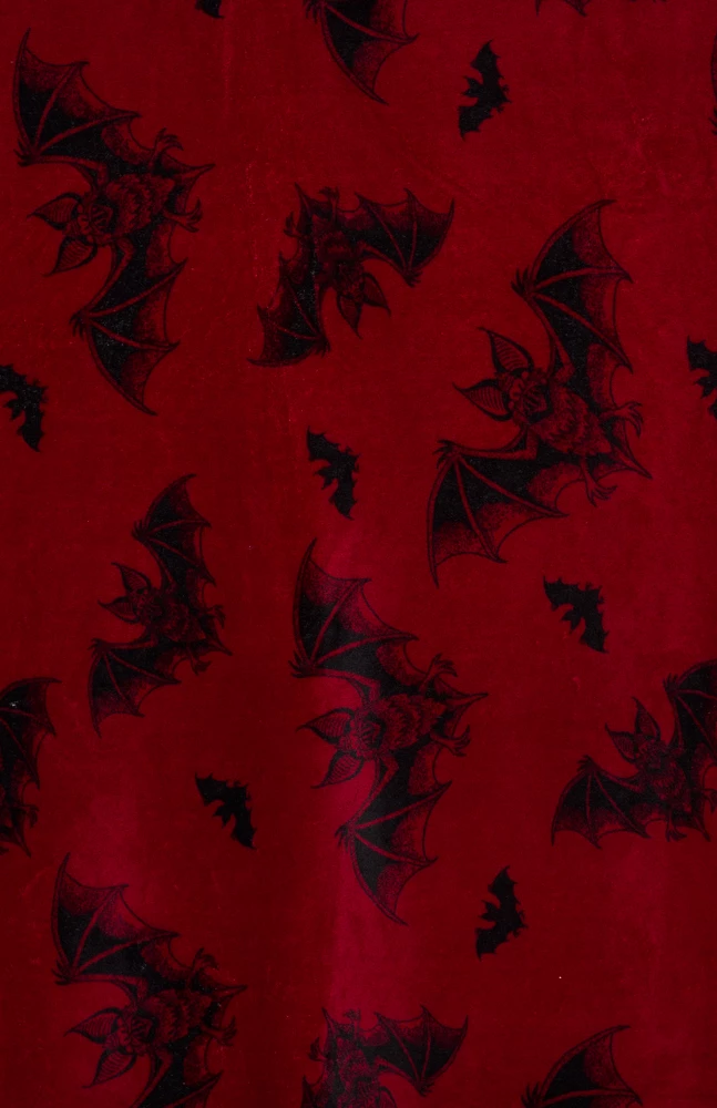 Wrap yourself in the super soft, maroon, fleece Sourpuss Batt Attack Blanket with black trim, featuring a black bats pattern. Perfect for your spooky abode all year long.