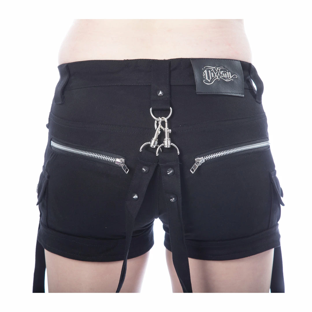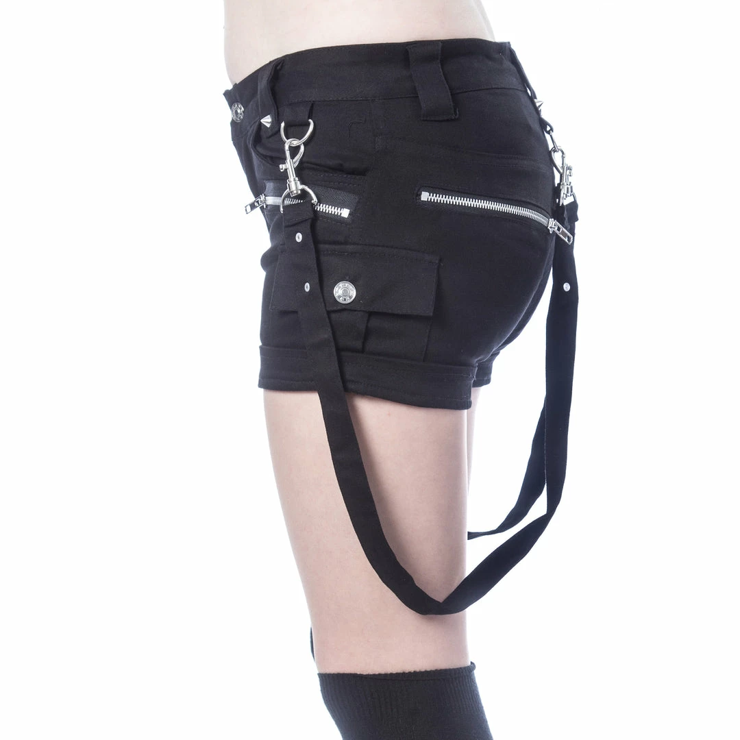 The Analia short is low-waisted with silver zipper and cone stud accents, 4 pockets in front, 2 pockets in back, and 1 pocket on each thigh, and a removable strap.
