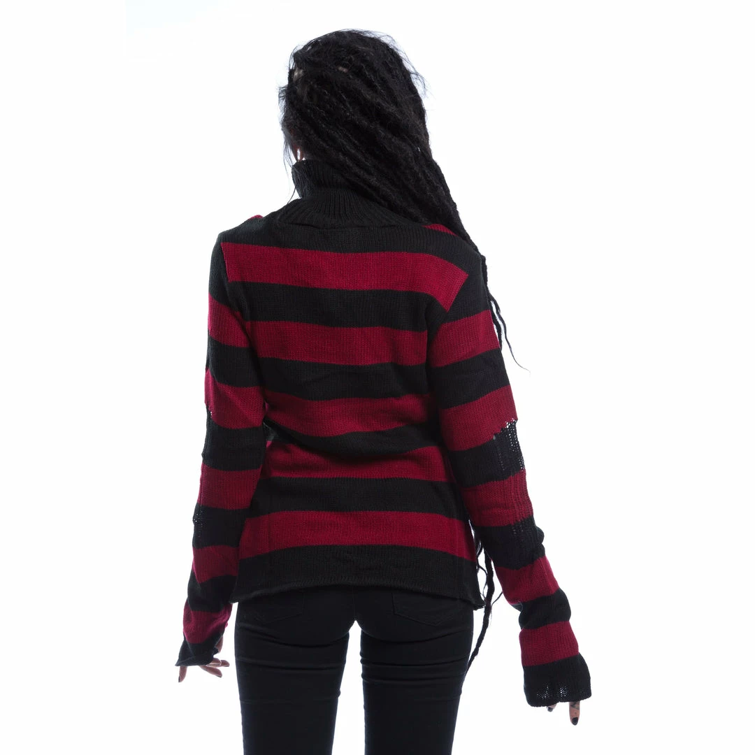 This black and red Annabella Distressed striped sweater by Vixxsin has distressed detail and the gothic knit has thumbholes and a high neck.