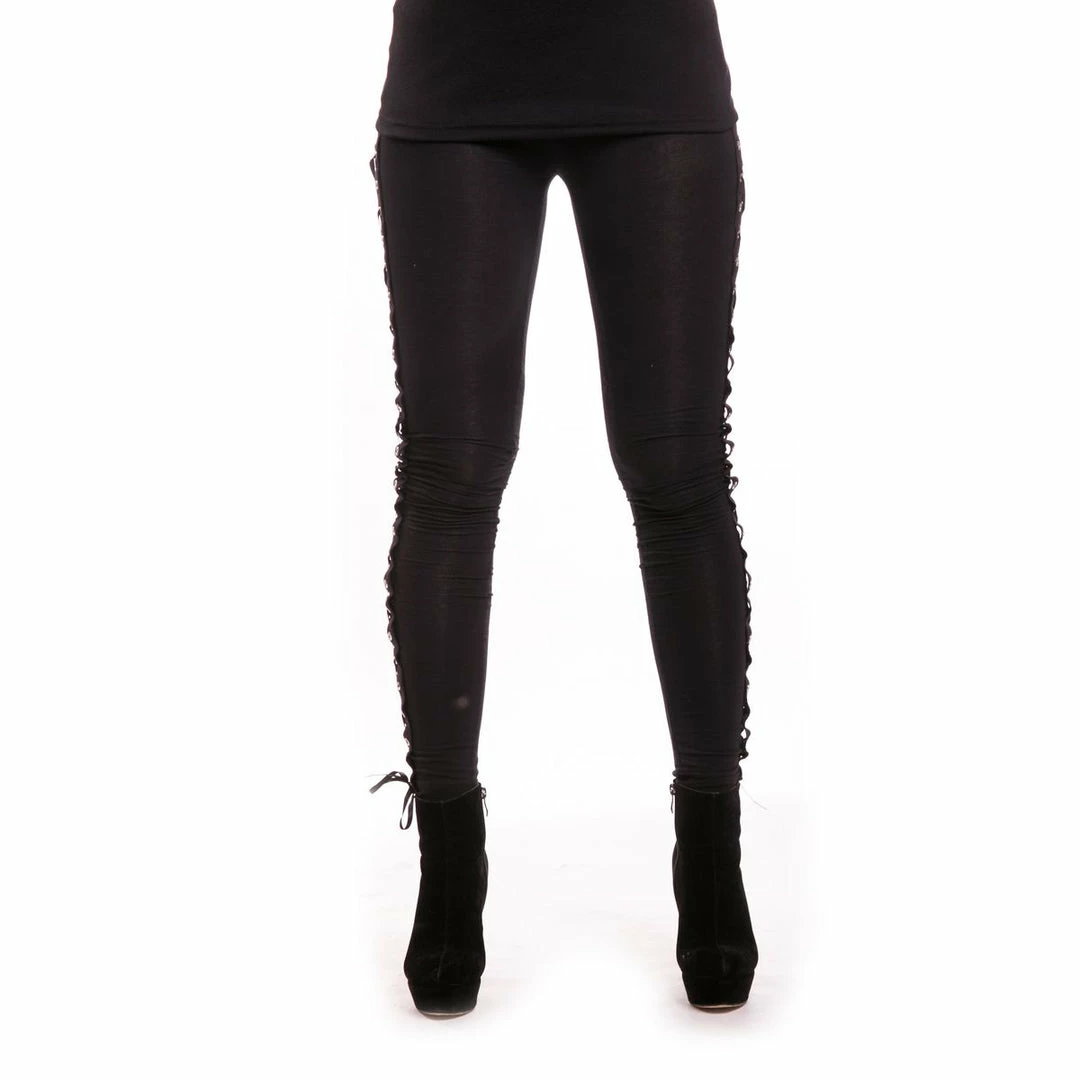 Black leggings with corset style lacing up the sides.
