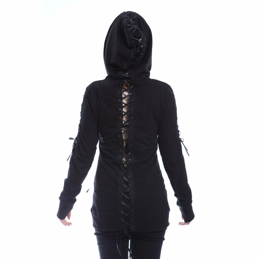 Fawn Hood by Vixxsin is a zip up hoodie with pockets and thumb holes. This gorgeous gothic hood has a full length ribbon laced back and more lacing on the pockets and sleeves.