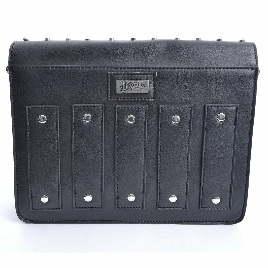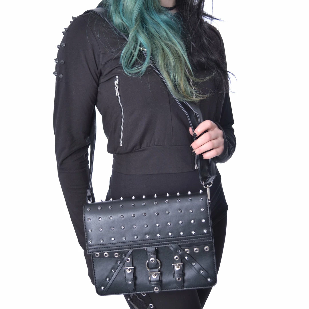 Black faux leather handbag featuring silver cone studs, buckles and straps with a magnetic closure. Features a detachable strap and can be used as a shoulder bag or a clutch.